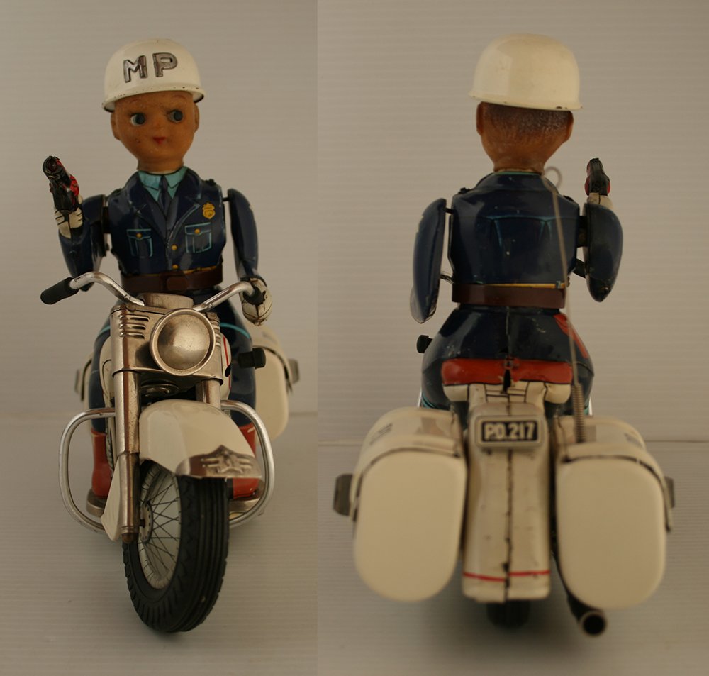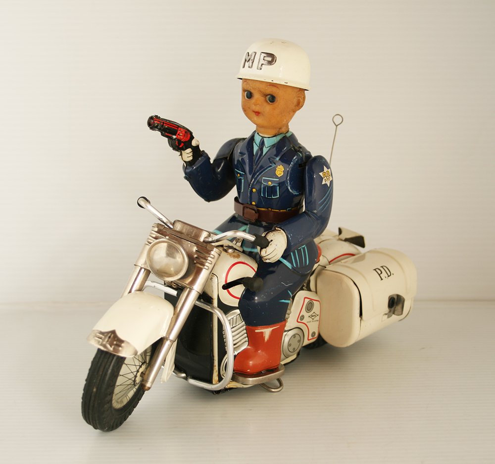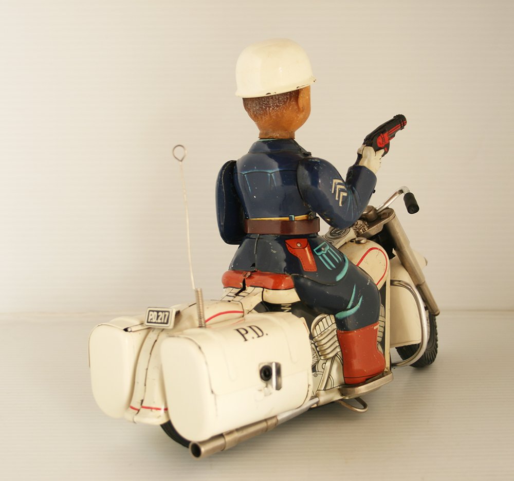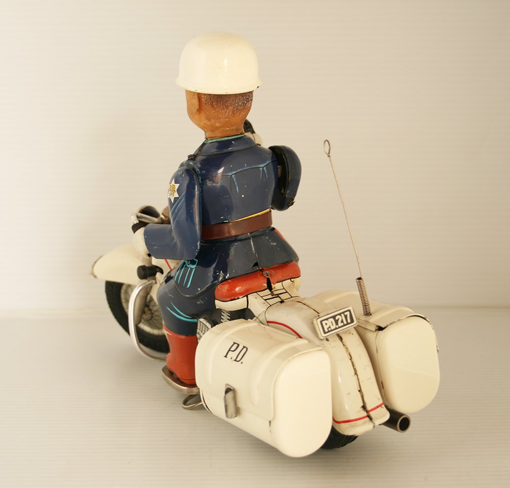 This complete P.D. Cycle is working and it is in good condition, it has some scrapes on body and chassis, the tin body police has a few scrapes, the hubcaps are clean, two battery boxes are clean, battery covers are repro, it has already been used.